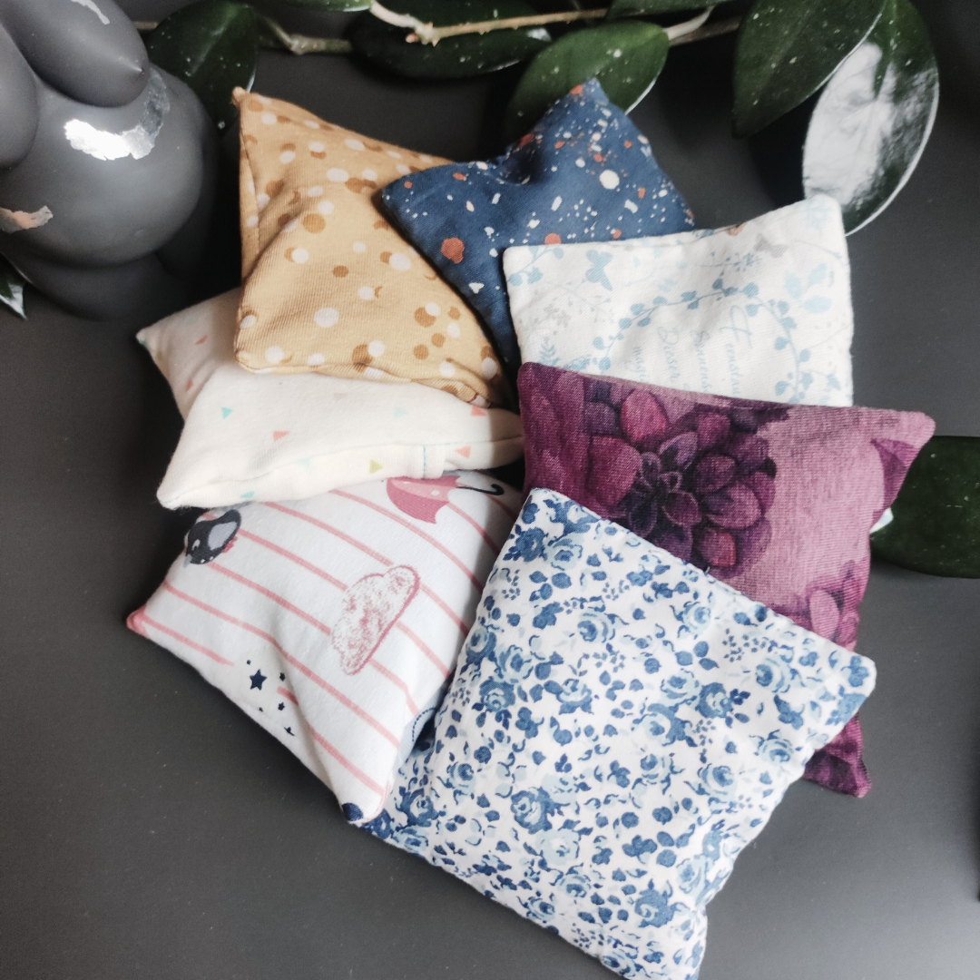 Jedes Kissen ist ca. 10x10cm groß und mit 12g Heilsteinen, ca. 1 EL Blüten/Kräutern und Traubenkernen befüllt. Das Gesamtgewicht beträgt ca. 60g. Es ergbit somit eine angenehme, aber "knetbare" Schwere in der Hand für all deine Einsatzwünsche.